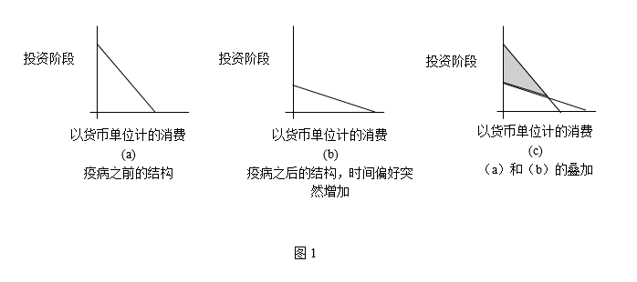 与上述情况相反,没有迹象表明当前的Covid-19疫病伴随着社会时间偏好率的显著变化(除了不确定性暂时增加的影响,这一点我们将在后面讨论)。首先,当前的情况绝不像薄伽丘在《十日谈》中描述的那样致命。正如我所指出的那样,劳动年龄人口的预期死亡率几乎可以忽略不计,对成功完成投资过程的预期在不久的将来仍会保持不变。(例如,人们仍然在投资未来的电动汽车的设计、创新和生产以及许多其他长期投资项目。)而且,由于社会时间偏好率基本保持不变,因此在哈耶克图表中以简化方式描述的资本财货阶段的生产结构也保持不变,只是有以下三种影响:一种是短期的,另一种是中期的(一到三年),以及长期的(可能会变成无限期的)。