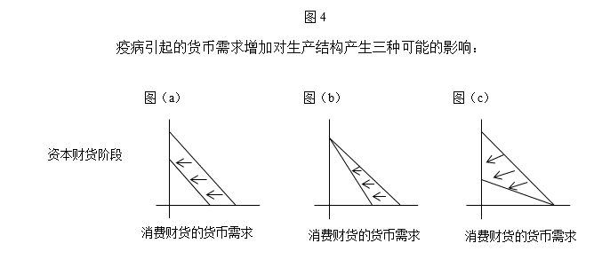 现在,对我们而言,更具分析意义的是像当前这样的疫病(其危害性要小得多,并且,在这样的疫病中,尽管大多数人没有性命之忧,但不确定性的确在加剧,尤其是在最初的几个月)的传播广度、演变和速度,及其在经济和社会上的影响。现金余额是应对未来无法避免的不确定性的典型手段,因为它们使经济行动者和家庭能够保持所有选择的余地,从而在出现任何未来情况时能够非常快速、轻松地进行调整。因此,可以理解的是,由当前的疫病引起的不确定性的自然增加伴随着对货币需求的增加,因此,在其他条件相同的情况下,其购买力也随之增加。图4可以帮助我们将其可视化。该图包含几个三角图,这些三角图表示以货币需求计的生产结构。这些图将货币需求增加的影响描述为:当时间偏好率不变时,斜边向左匀速移动(图a);当通过减少消费积累现金余额时,反映更大相对投资的向左移动(图b),当通过出售资本财货和金融资产而不是减少消费来积累新货币时,反映更大相对消费的向左移动(图c)。